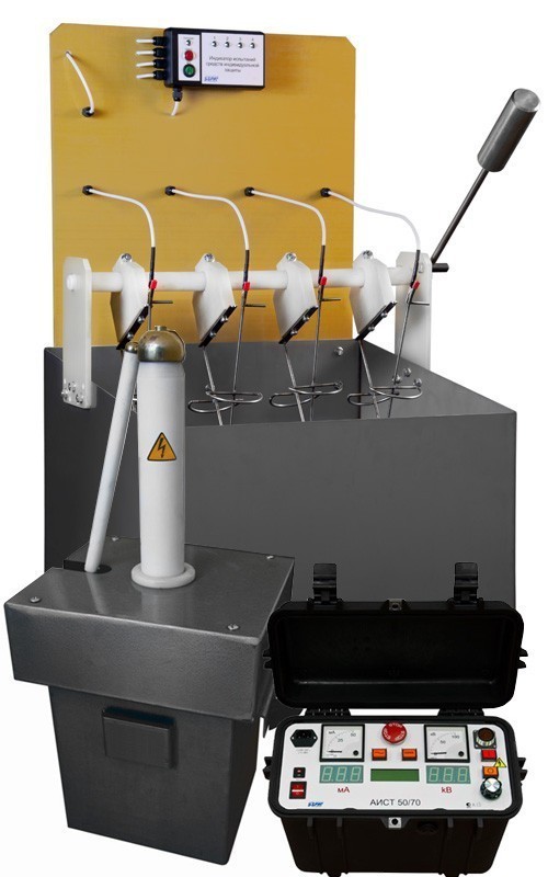 Высоковольтная испытательная установка аппарат для испытания электрооборудования и средств индивидуальной защиты (СИЗ) АИСТ 50/70 СИЗ в комплекте с ванной для испытаний СИЗ предназначена для испытания электрооборудования, электрической прочности изоляции силовых кабельных линий, твердых диэлектриков высоким напряжением переменного тока промышленной частоты до 50 кВ и постоянного тока до 70 кВ и средств индивидуальной защиты. В процессе испытаний измеряется ток утечки на каждом объекте испытаний.